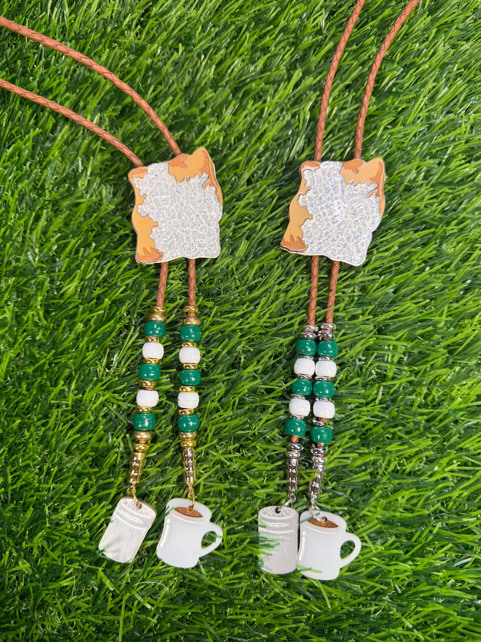 Green Beaded with charms! a subtle nod to a famous beignet establishment in new orleans. green and white beads with a cup of cafe au lait and a powdered sugar shaker as the charms