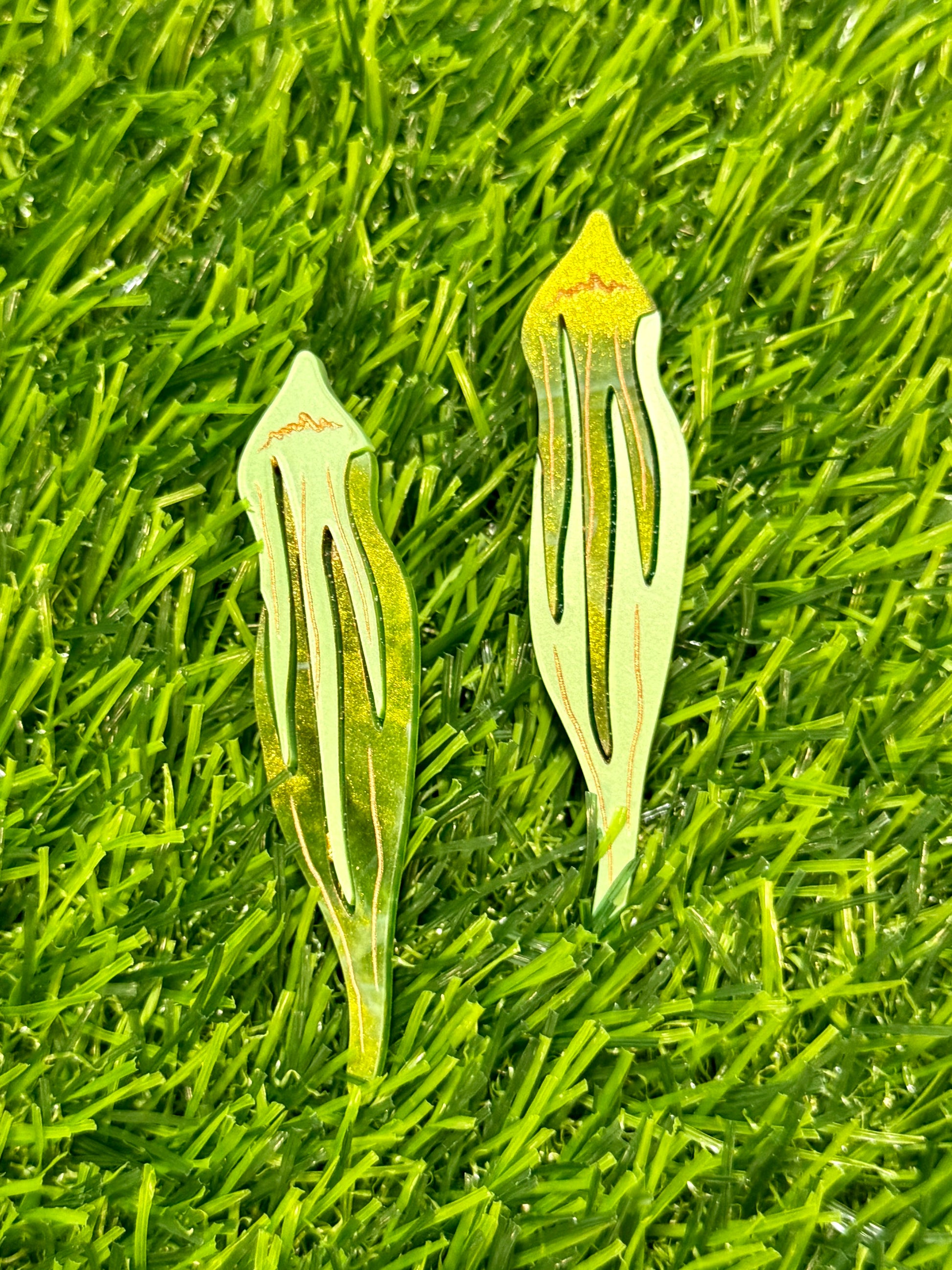 Most of my earrings are handmade from resin and glitter. I have a few made from polymer clay and I'm making more and more out of laser cut acrylic. Best care for plastic earrings is to wash with soap and water. DON'T USE RUBBING ALCOHOL OR NAIL POLISH REMOVER TO CLEAN YOUR EARRINGS! It will make it sticky and weird and gross. don't do it.