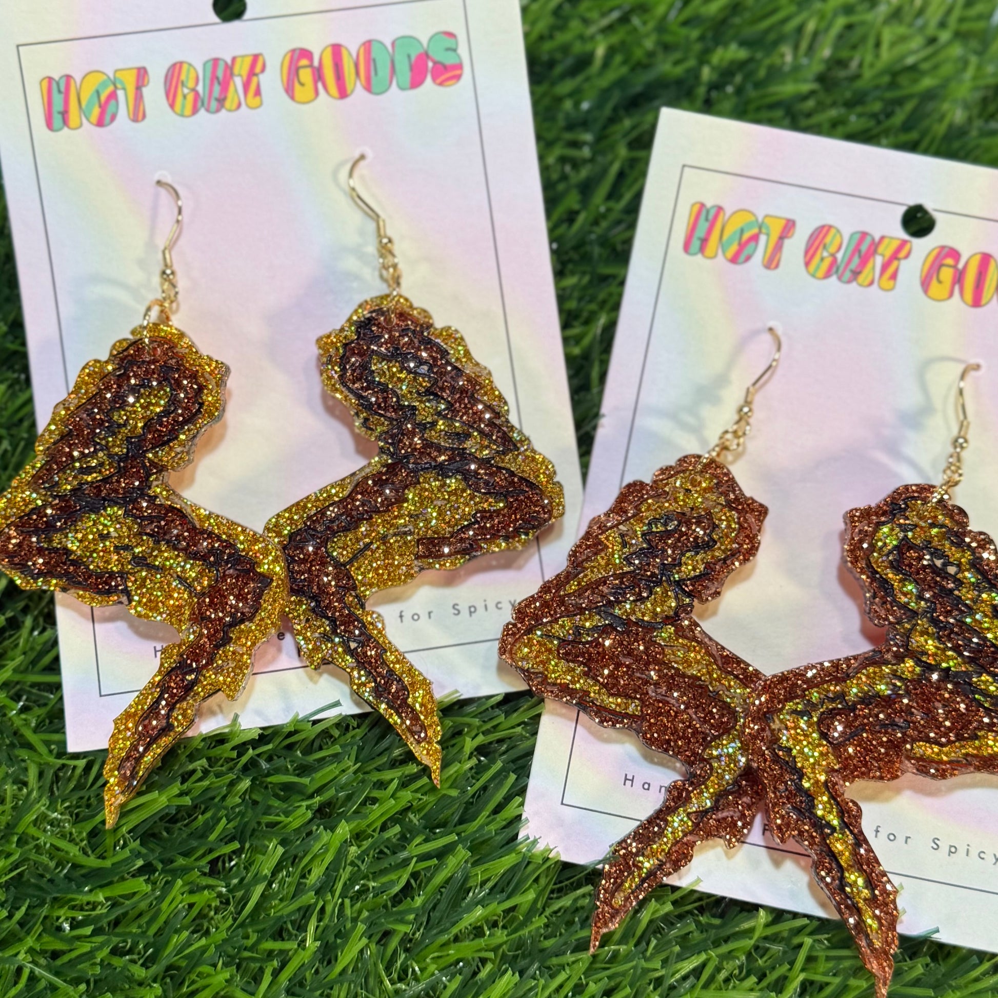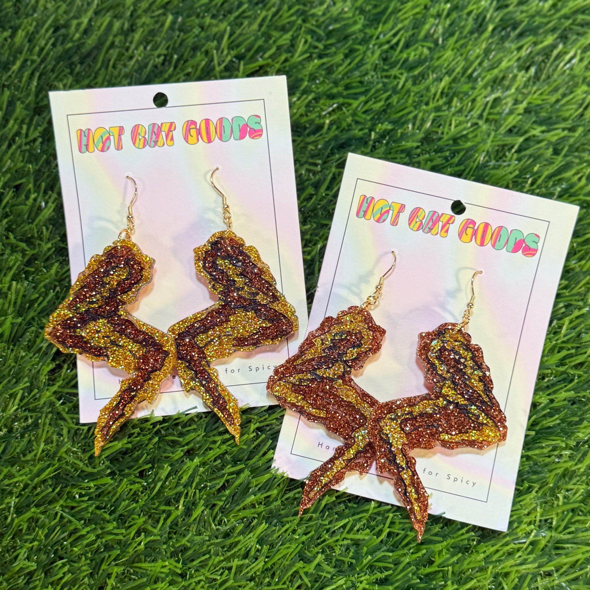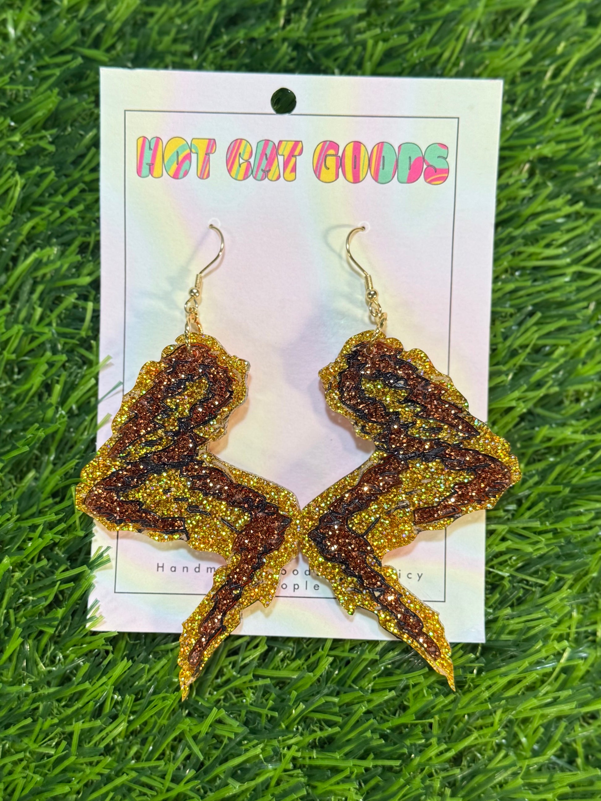 Most of my earrings are handmade from resin and glitter. I have a few made from polymer clay and I'm making more and more out of laser cut acrylic. Best care for plastic earrings is to wash with soap and water. DON'T USE RUBBING ALCOHOL OR NAIL POLISH REMOVER TO CLEAN YOUR EARRINGS! It will make it sticky and weird and gross. don't do it.